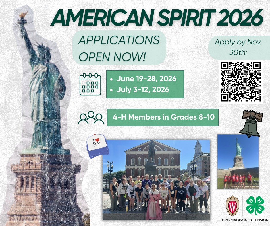 The 4-H American Spirit Experience empowers youth to take ownership of their learning and leadership through a 10-day educational journey exploring history, culture, and civic identity across the East Coast and Canada. While staff and volunteers support and facilitate the experience, youth are at the center, not just as participants, but as leaders, learners, and changemakers. They actively shape the experience by presenting content, leading discussions, reflecting on their learning, and building a vibrant community with peers from across Wisconsin