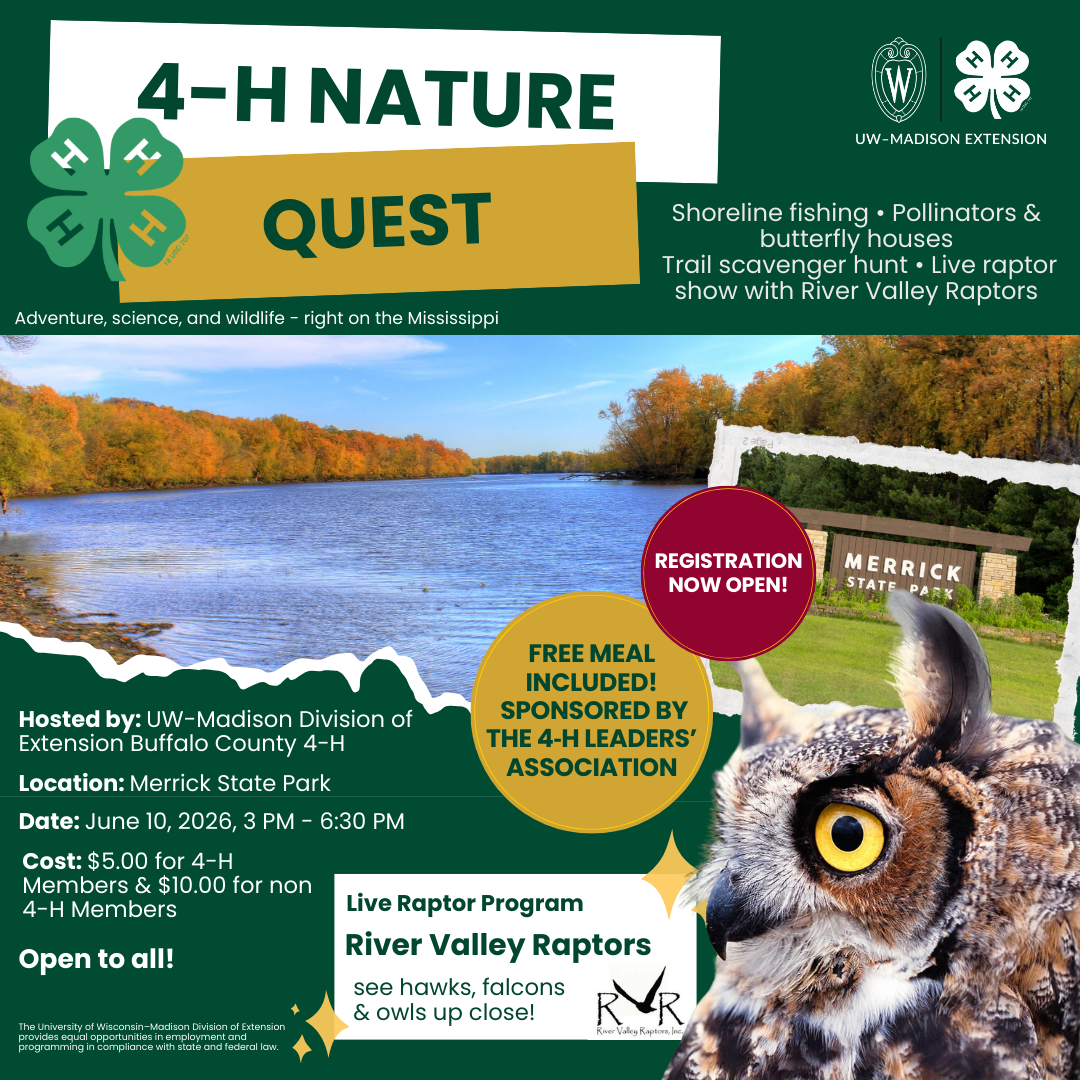 Buffalo County 4-H is excited to host 4-H Nature Quest at Merrick State Park on June 10, 2026!