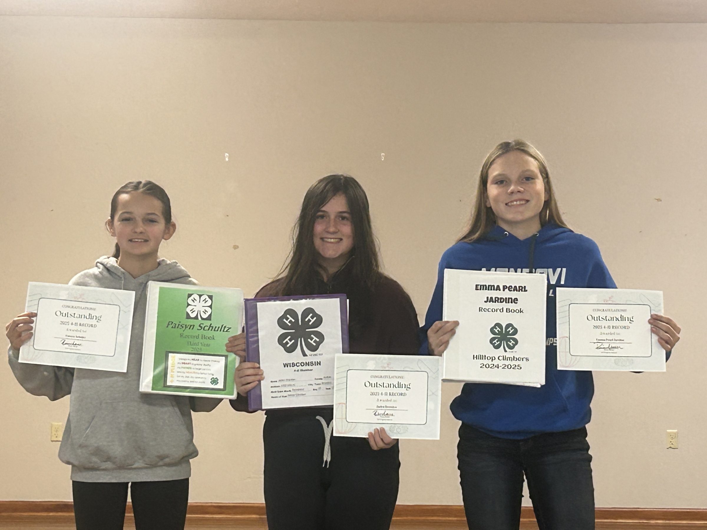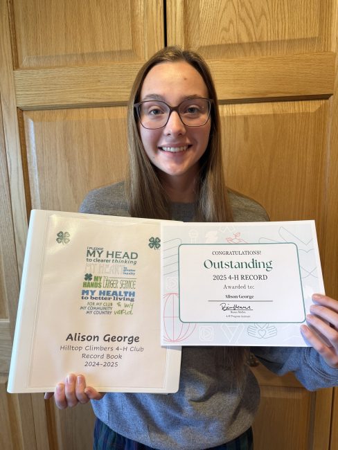 The November meeting is also the Awards Ceremony for the Hilltop Climbers. The Record Book Awards were given. All four 4-H members who submitted their record books earned an Outstanding: Jaden Brenden, Alison George, Emma Pearl Jardine, and Paisyn Schultz. The Leadership Awards for 2025 went to: Abby George, Katie Mayer, Lacy Bork, Deanna Hayde,n and Julia Moats – 1-year leader. Rodney Moats was awarded the 10-year leader award. The volunteers were congratulated for their dedication to 4-H and the Hilltop Climbers 4-H Club.