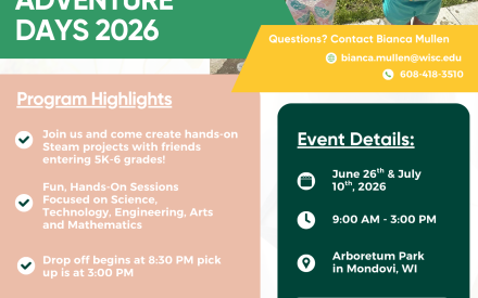 Dates: July 14 & 15, 2026Time: 9:30 AM – 3:30 PMLocation: Nugget Lake County Park, Plum City, Wisconsin Join us for two days of outdoor adventure at Nugget Lake! 4‑H Outdoor Explorers: Nugget Lake is a fun, hands-on day camp designed for youth in grades 3–6 who enjoy being active, creative, and curious about the […]