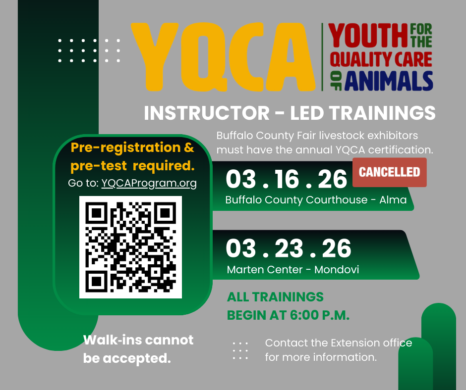 According to the Buffalo County Fair in affiliation with Pepin County Junior Fair Rules: All Dairy, Beef, Sheep, Swine, Goat, Poultry & Rabbit exhibitors must complete the Youth for the Quality Care of Animals (YQCA) training each year to be eligible to exhibit their animal(s) at the Buffalo County Fair. Must be complete by July 1st.